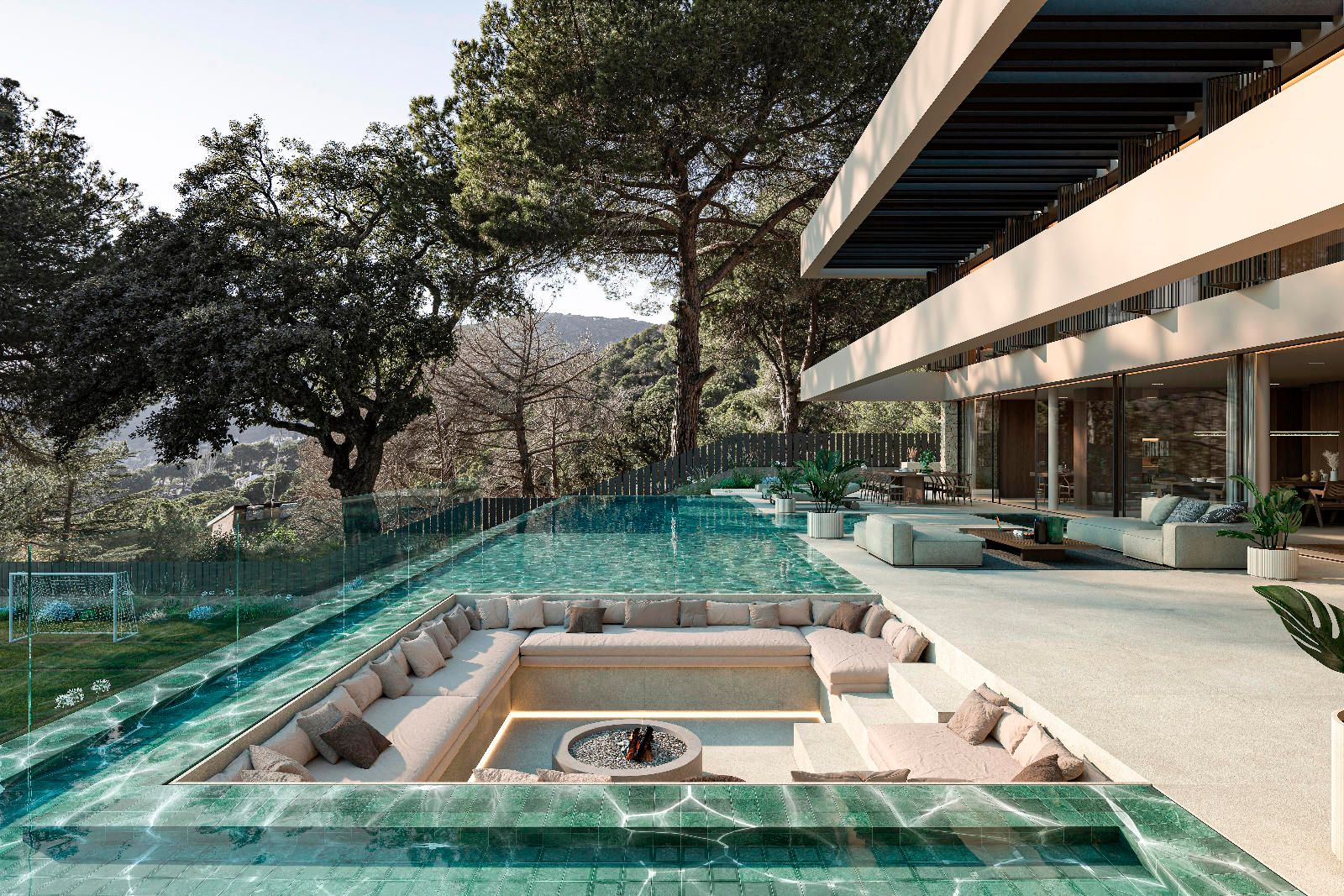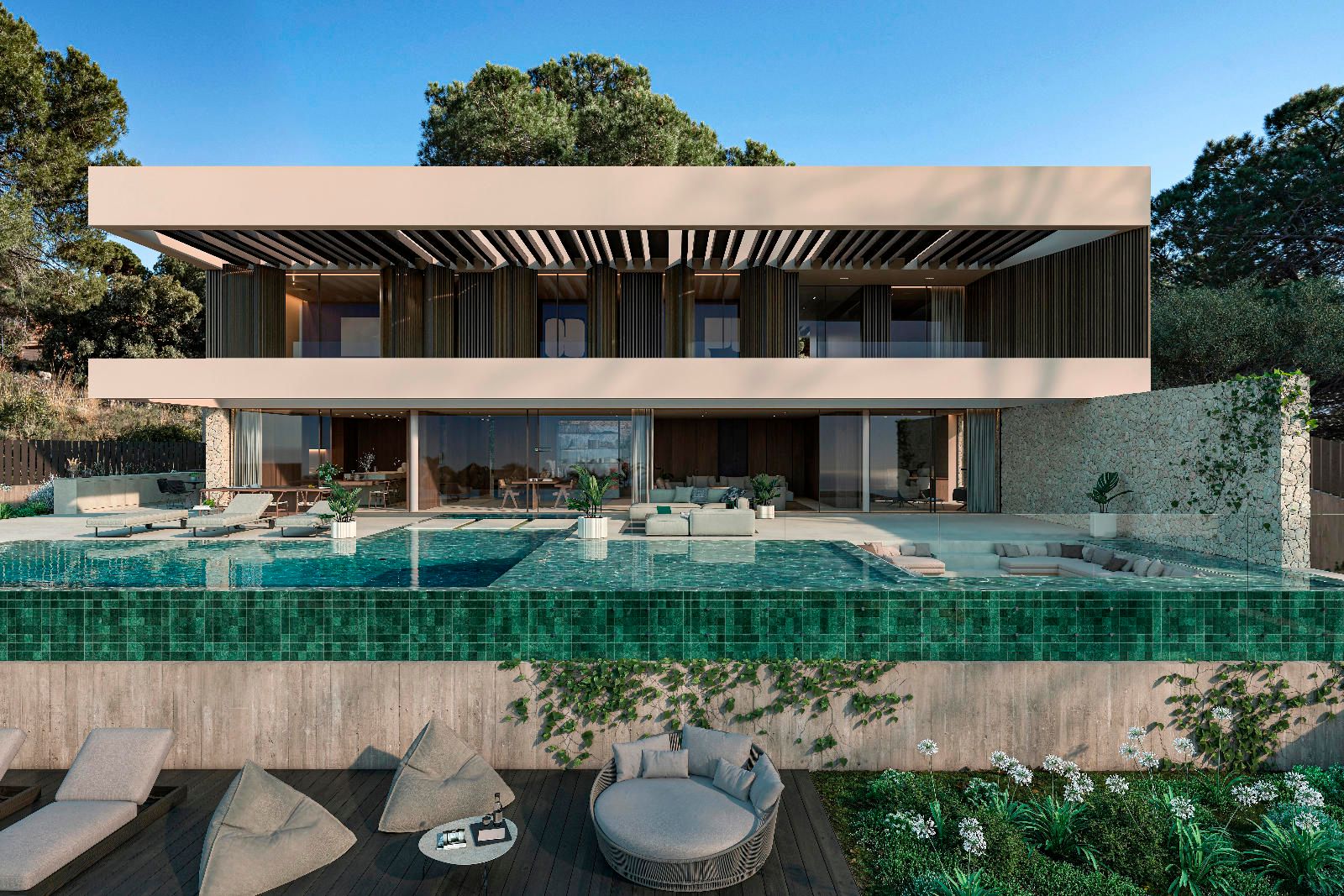Nature surrounds the entire house, starting from the pedestrian entrance through a small access garden. The front garden, in shades of green, houses a private pool where you can cool off and enjoy the water, either in the deep end or at the beach-like entrance