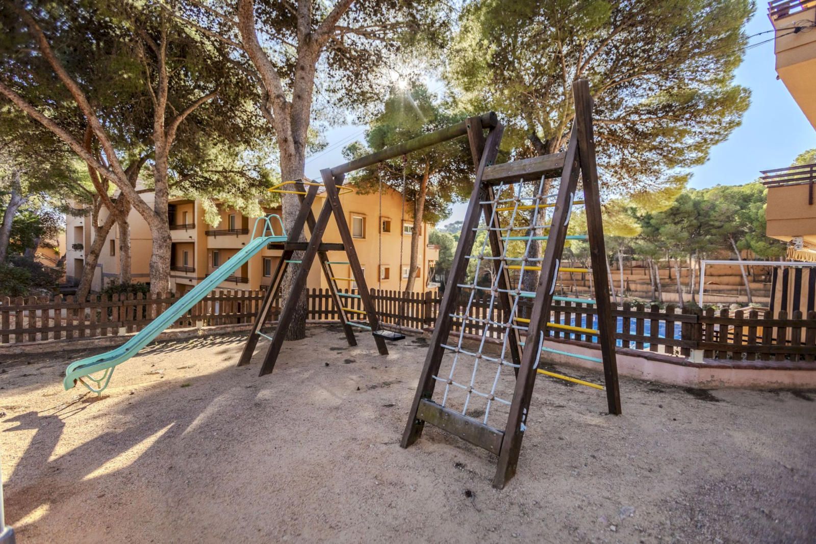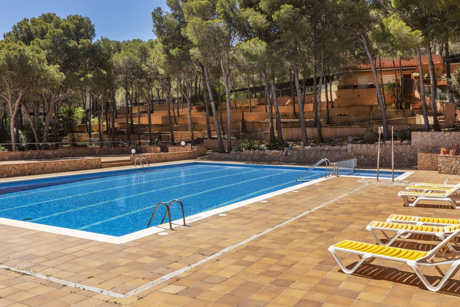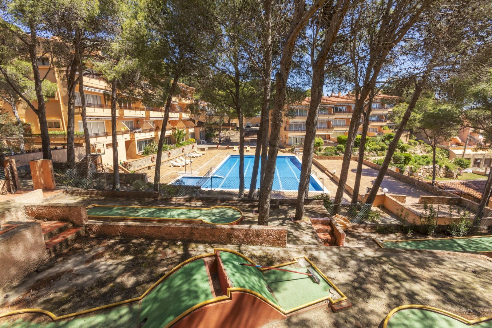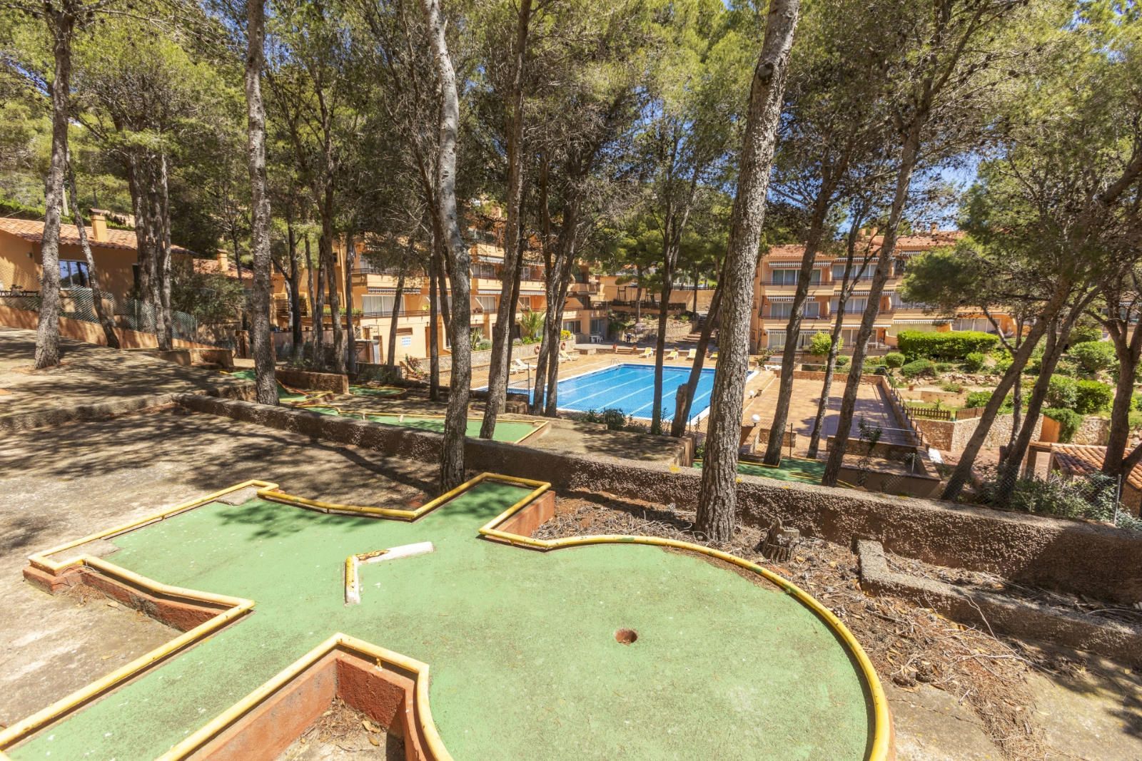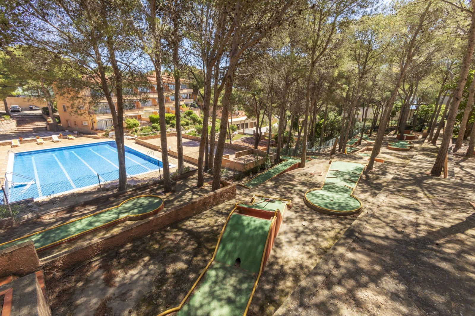una amplia piscina, zonas verdes, zona infantil, pista de tenis, minigolf y espacios para relajarse sin salir del complejo.