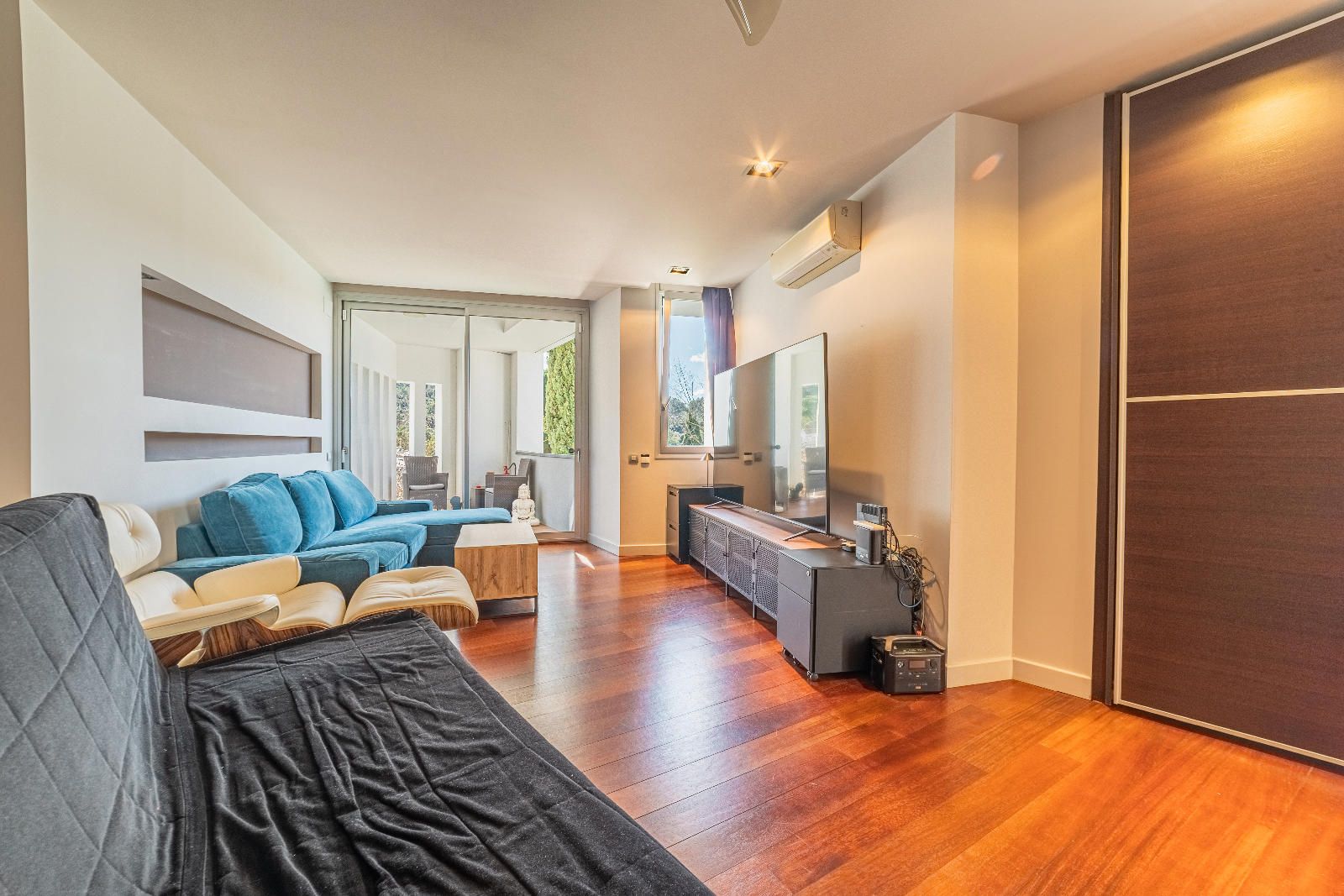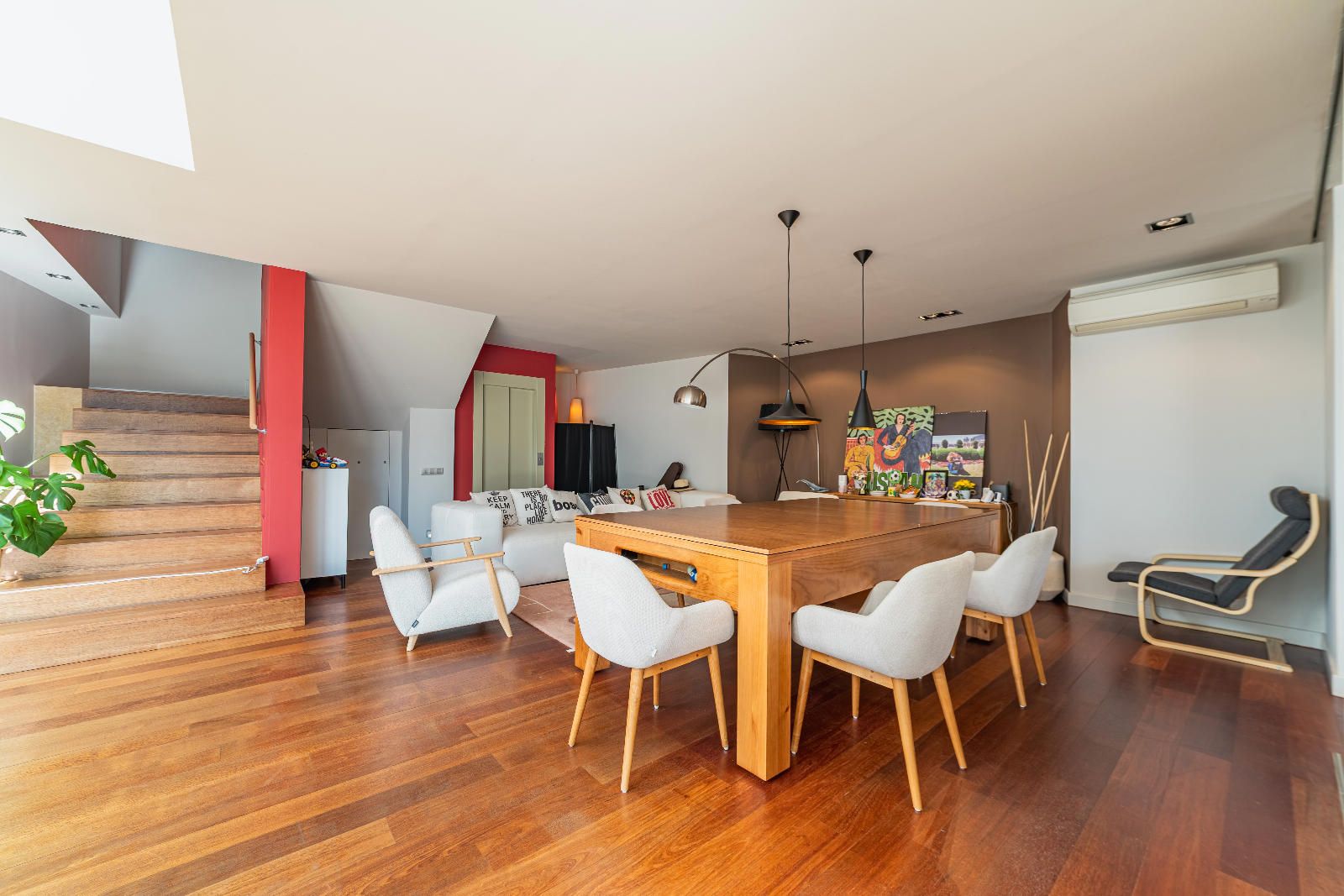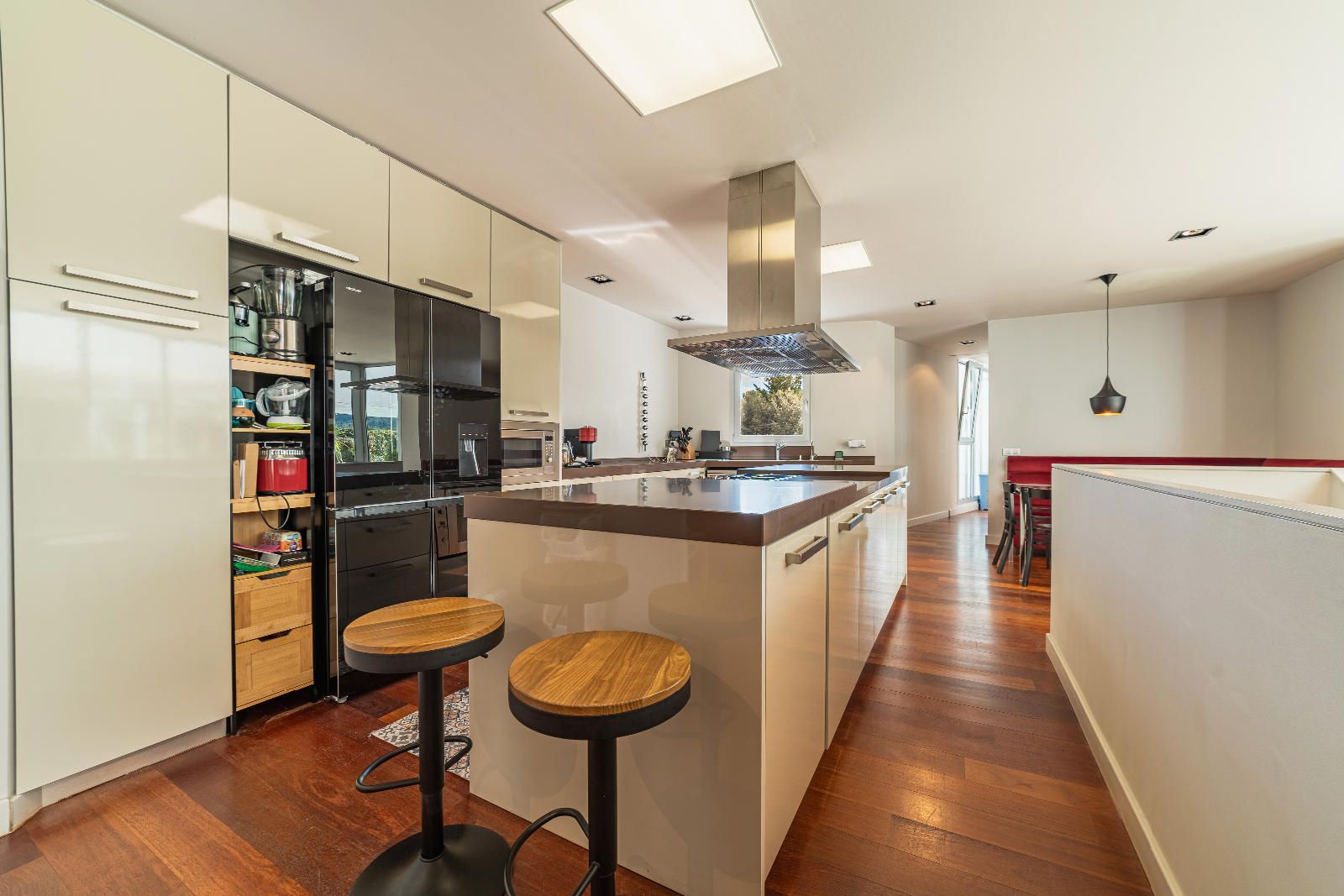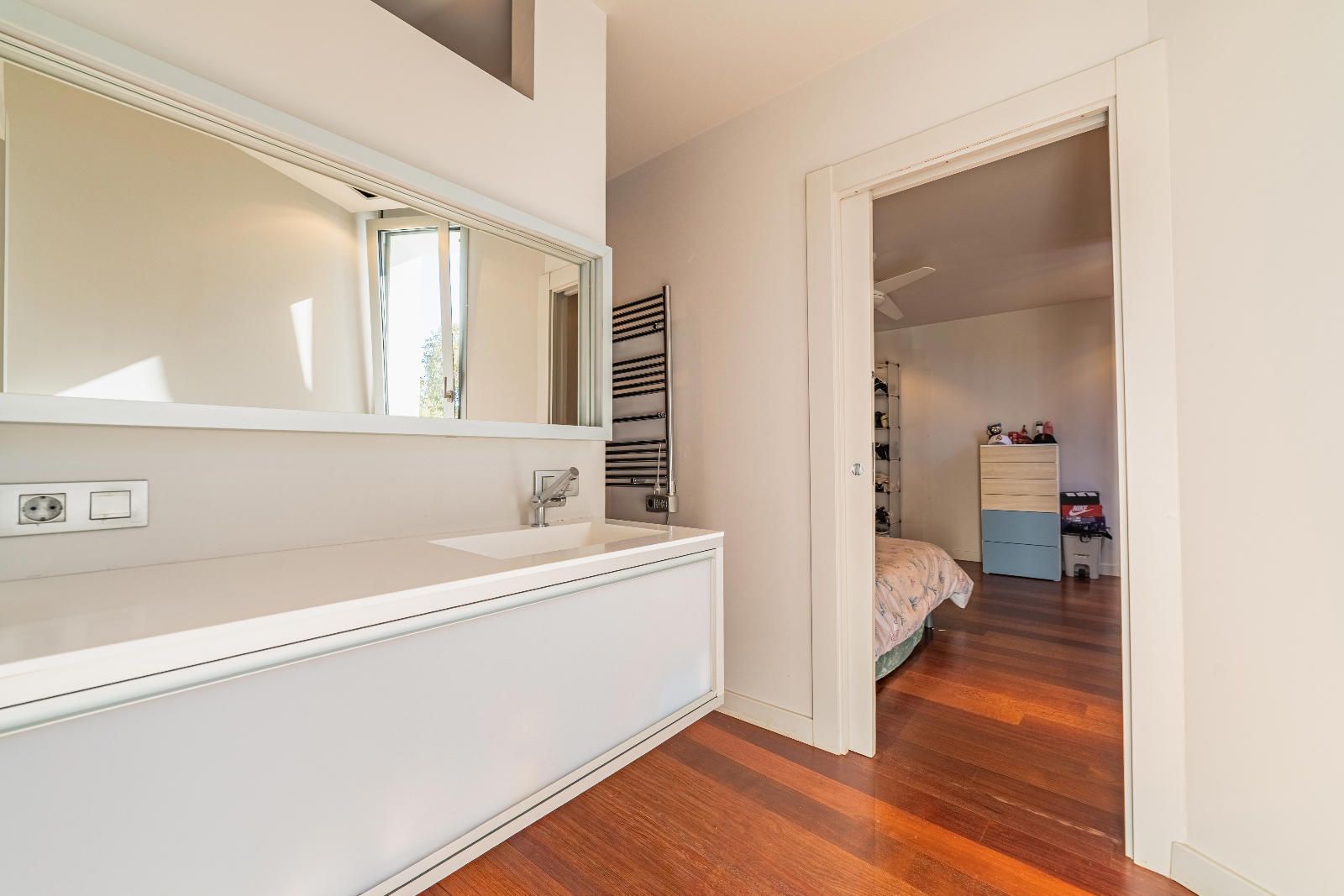 À l’étage se trouve la zone nuit. Deux bureaux — dont un avec salle de bain complète — offrent des espaces idéaux pour le télétravail. La suite parentale dispose d’une terrasse privée avec vue sur la piscine et l’environnement naturel de Collserola. De l’autre côté, deux chambres doubles et une suite supplémentaire complètent une distribution confortable et harmonieuse.