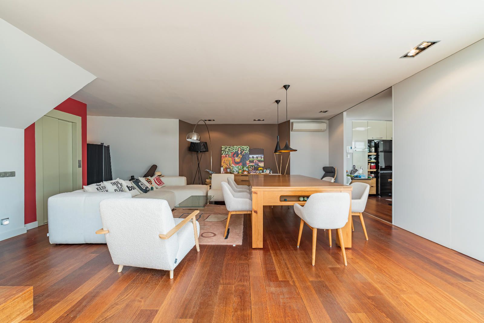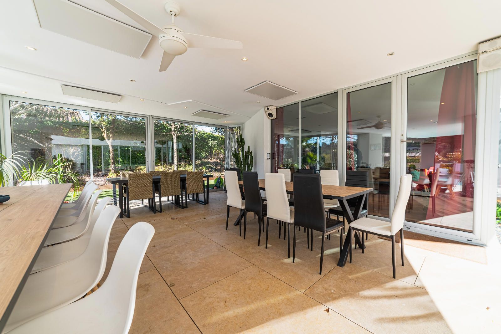 Le salon-salle à manger, réparti en deux ambiances, et la cuisine ouverte avec espace repas donnent directement sur le porche et la piscine. Le porche vitré et climatisé permet de profiter de l’extérieur toute l’année, été comme hiver.